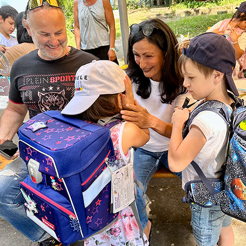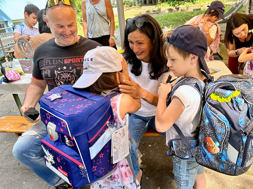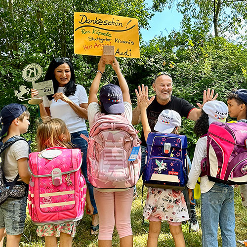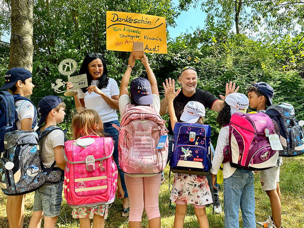 Schulranzen und die Erstausstattung für die Erstklässler von unserem Stuttgarter Kiwanis Preisgeld bei der Übergabe mit dem Präsidenten von Stuttgarter Kiwanis Zoltán I. Bagaméry